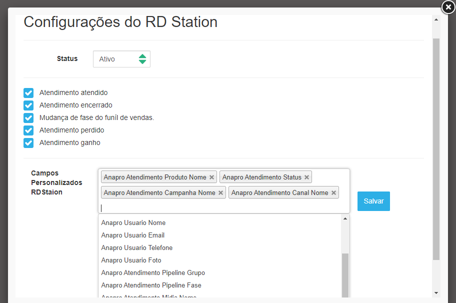 - Atendimento encerrado – toda vez que um atendimento for encerrado os dados serão enviados para o RD Station.