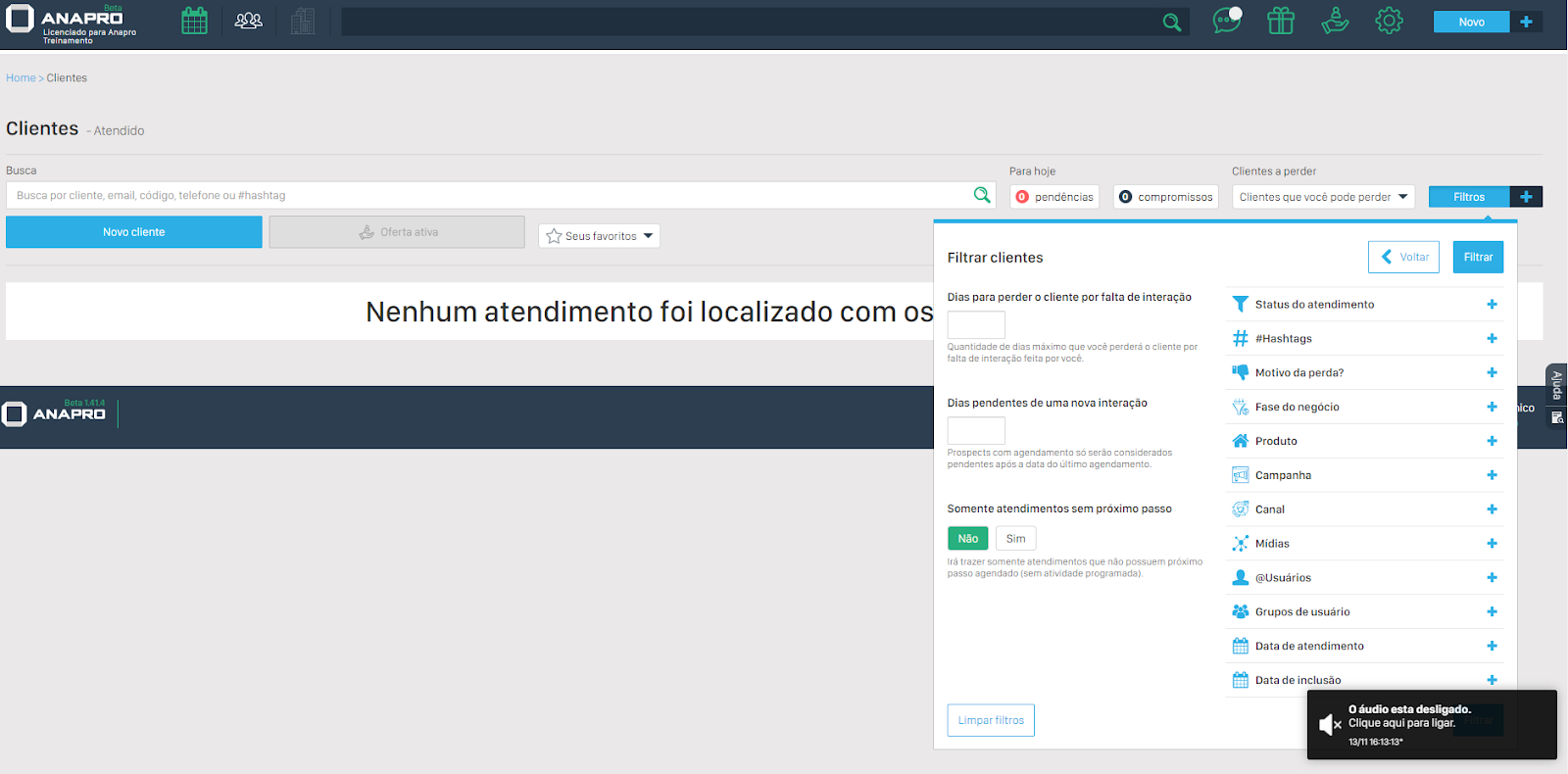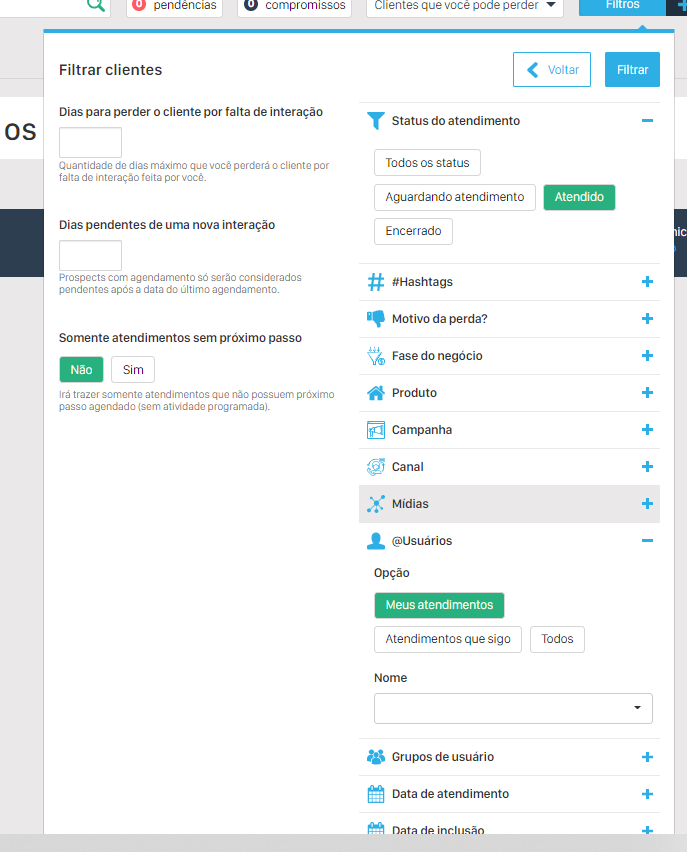 Primeiro, aplique os filtros desejados para localizar os atendimentos que você quer exportar. No centro superior da tela, à direita, clique em “Filtros” (ícone de +).