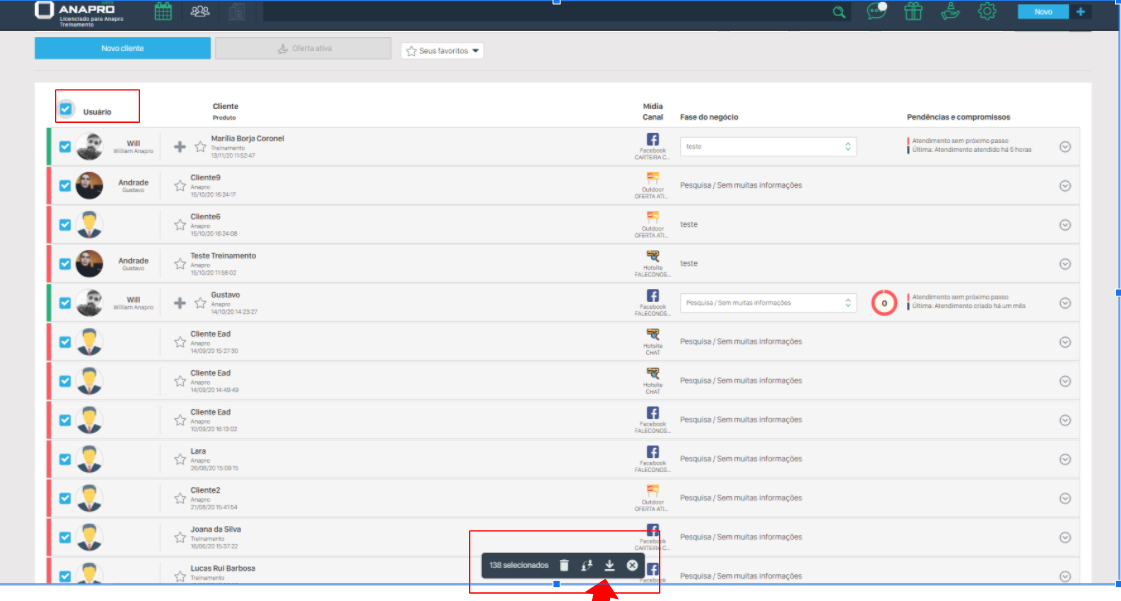 Selecione o primeiro checkbox no topo da lista de leads — isso marcará todos os atendimentos da página.