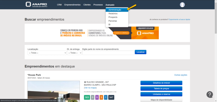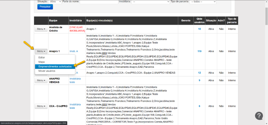 Feito isso iremos selecionar a equipe que deverá visualizar o empreendimento indo em Menu > Empreendimento Autorizados.