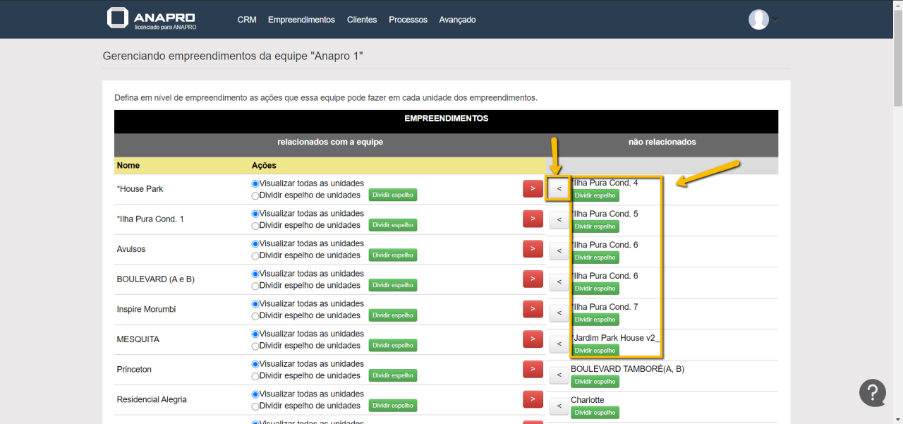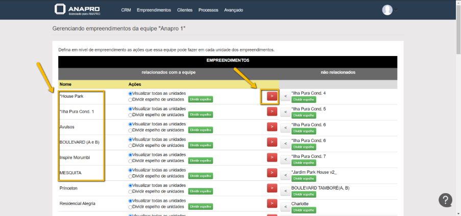 Na primeira coluna vemos os empreendimentos que já estão autorizados para a equipe, e clicando na seta VERMELHA tiramos a visualização do mesmo para a equipe selecionada.