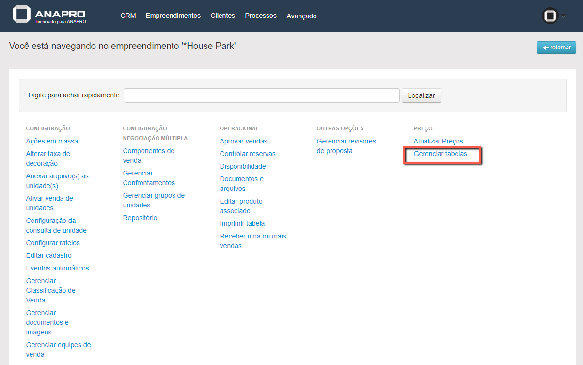 Escolha a opção "Gerenciar Tabelas".