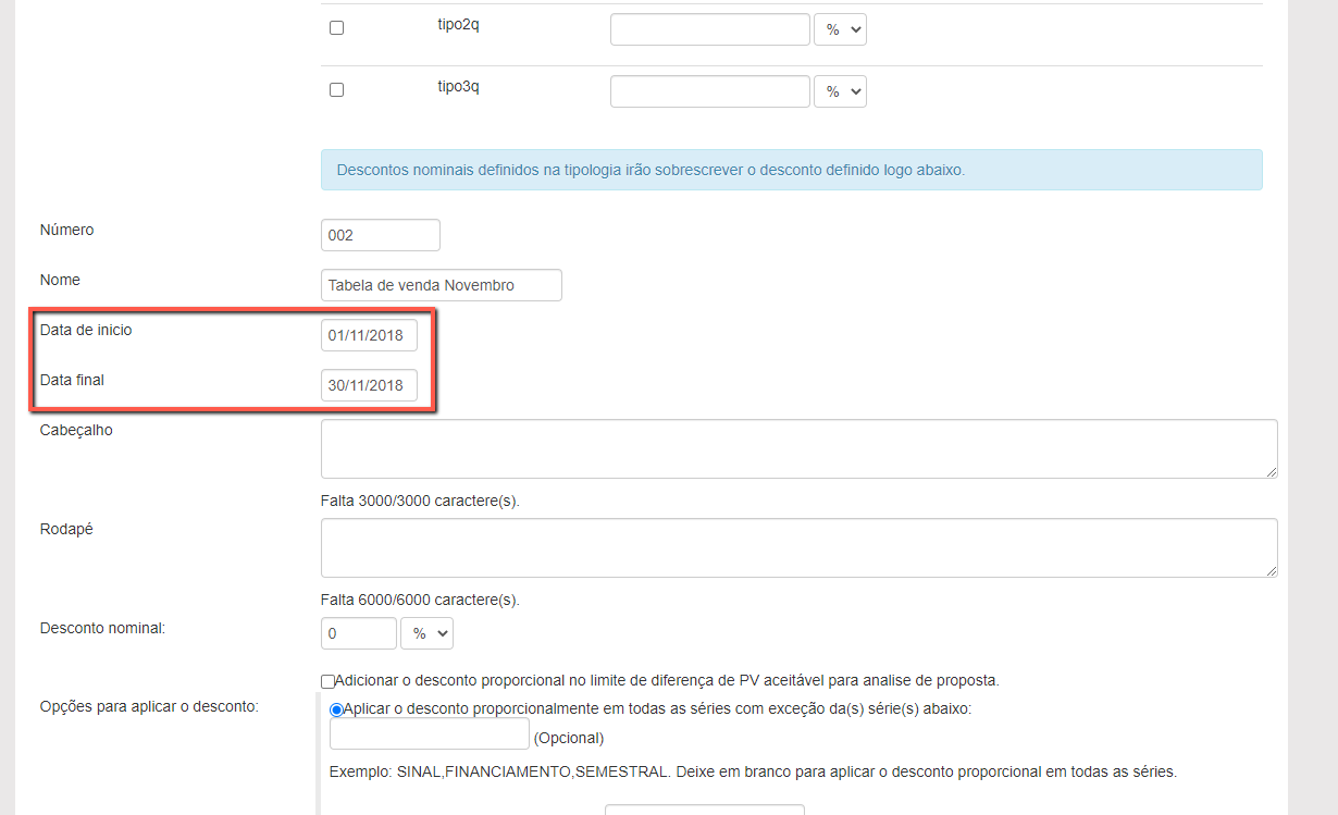 Caso a tabela esteja vencida, será necessário alterar a "Data final". Caso a mesma ainda não esteja em vigência, será necessário alterar a "Data início".