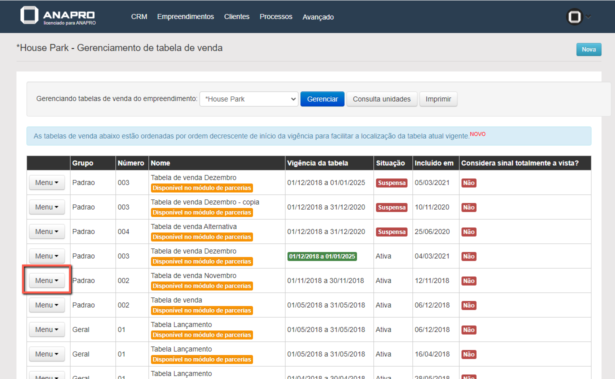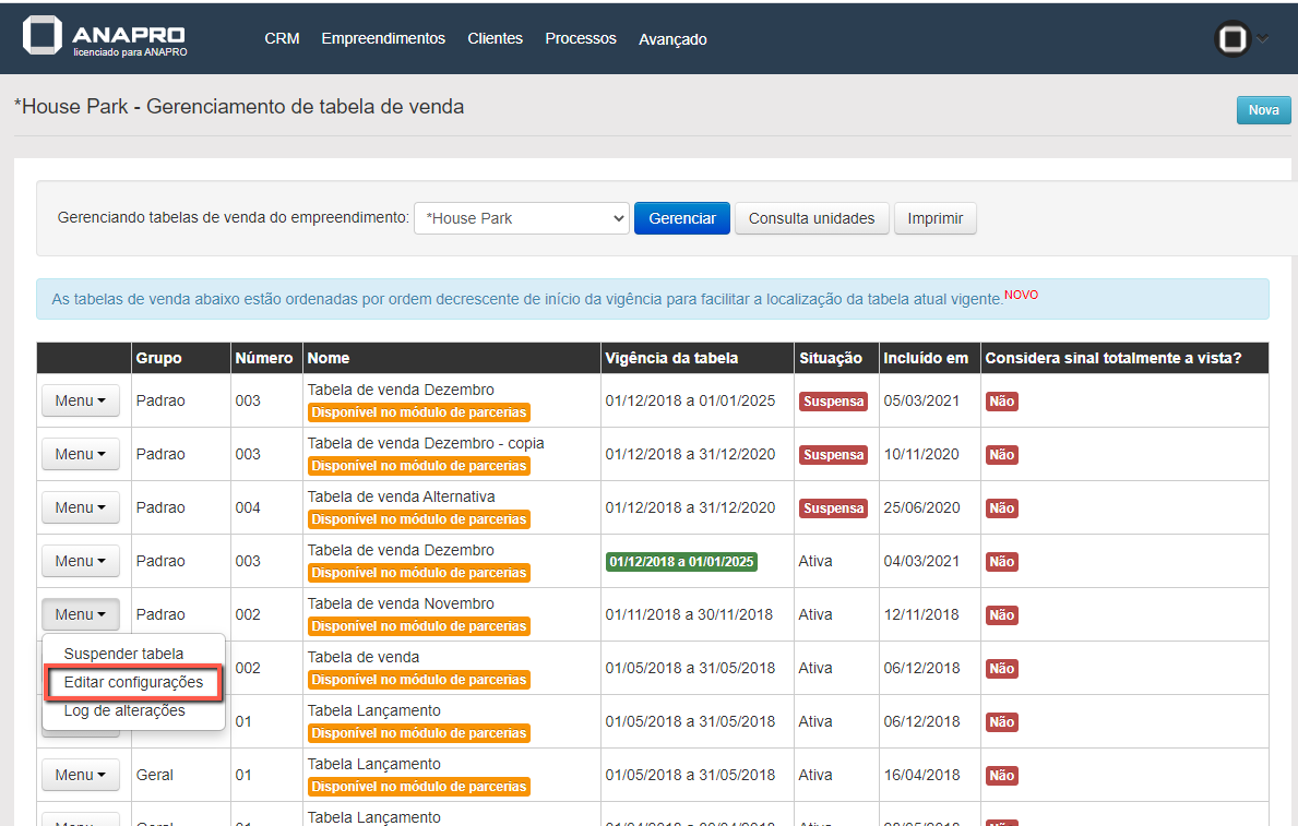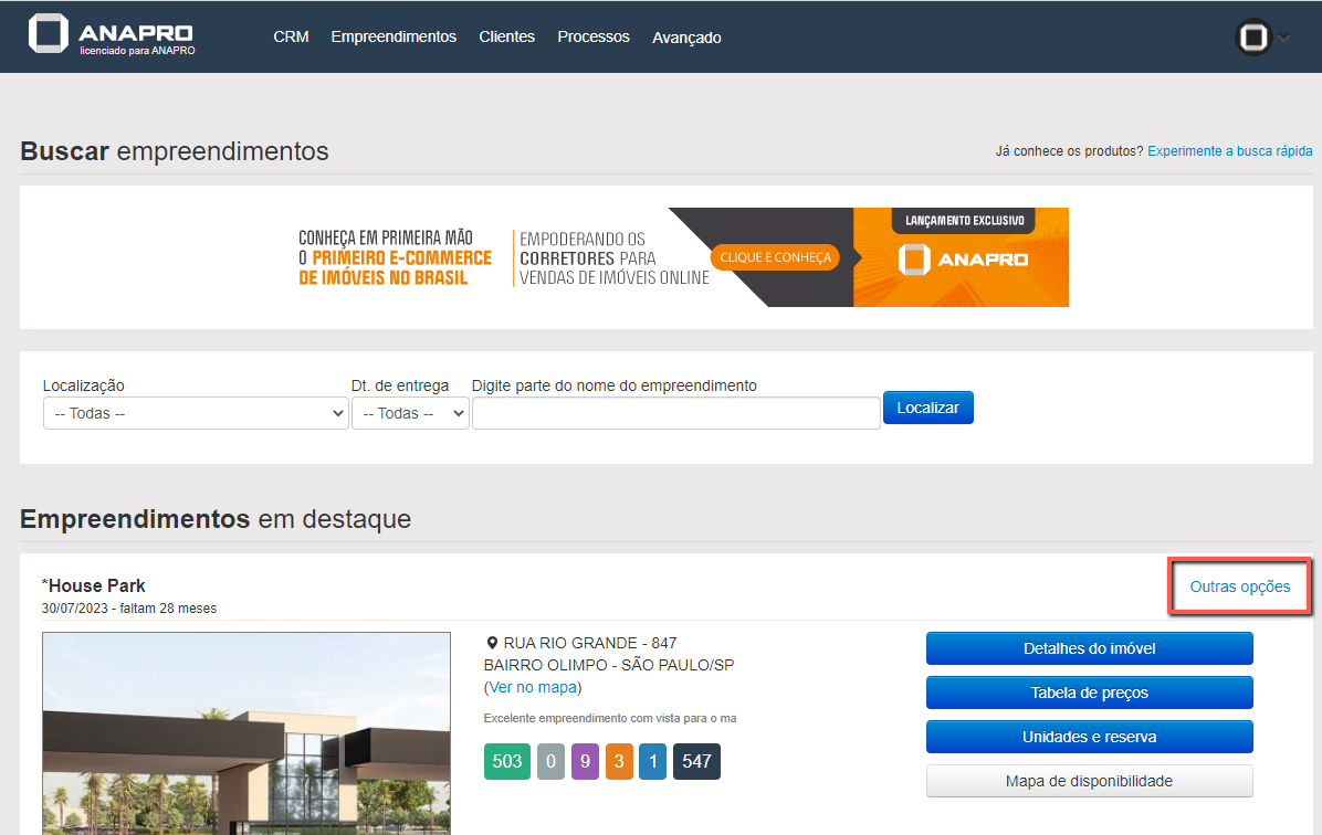 Será necessário acessar a opção "Outras Opções" do empreendimento que deseja alterar a data de vigência,