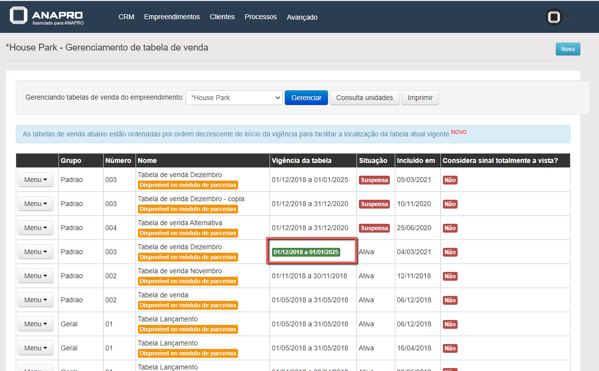 Após salvar, a data de vigência já constará na tabela corretamente.