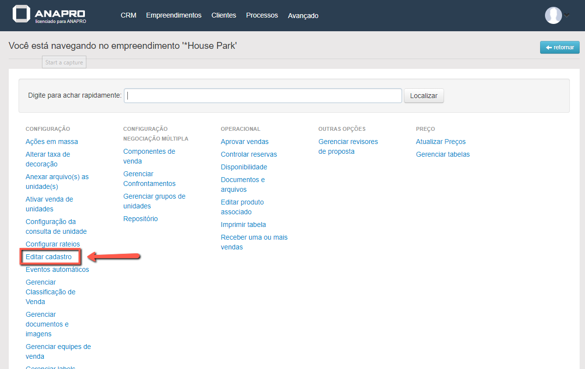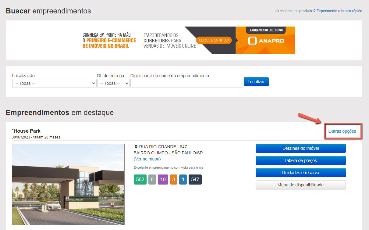 Para começarmos, é necessário ir em "Outras opções" do empreendimento em questão.
