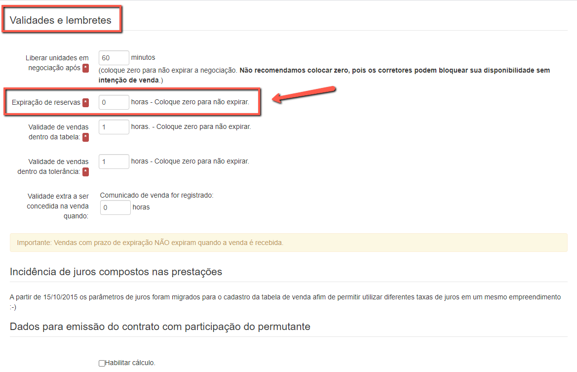 Aparecerá a seguinte tela chamado "Cadastro de Empreendimento", deslize a página até encontrar o título "Validades e Lembretes" , terá a opção "Expiração de reservas", nesta opção você pode definir em horas a expiração da reserva. Ex.: 48h (dois dias), caso não queira que expire deverá deixar com o 0 (zero).