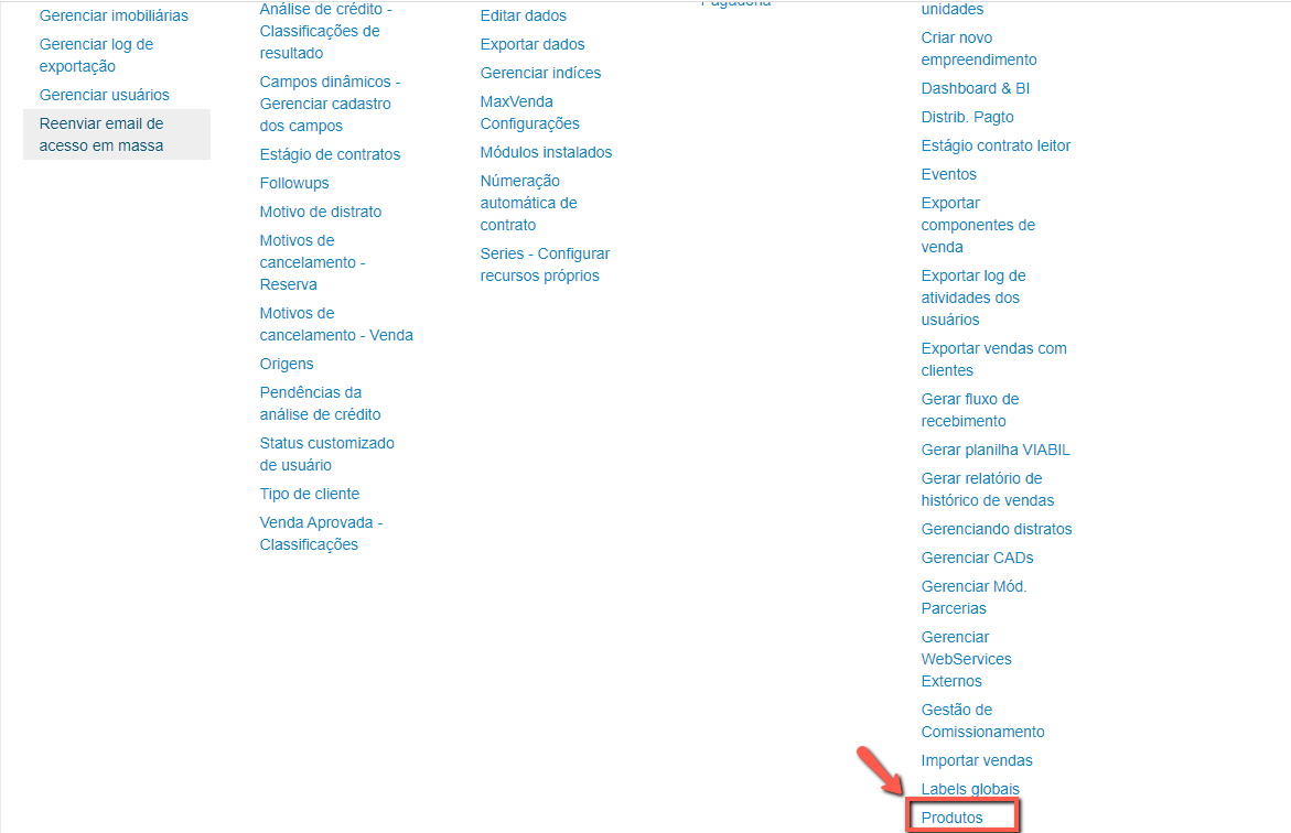 Do lado direito da tela, na coluna outras opções, selecionar a opção "Produtos" .