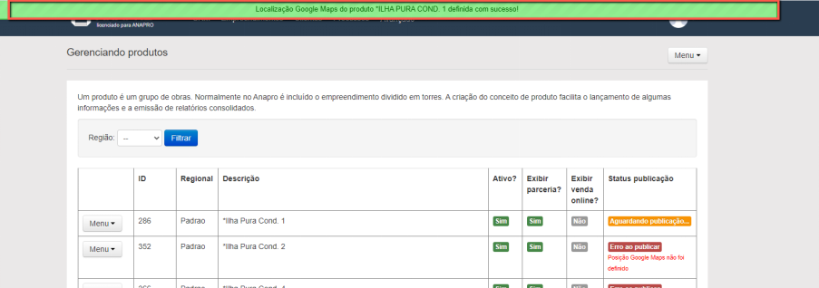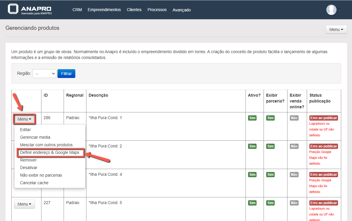 Abrirá a tela Gerenciando Produtos, localize o empreendimento que deseja incluir o bairro, clique no "Menu" ao lado esquerdo e clique em "Definir Endereço & Google Maps".