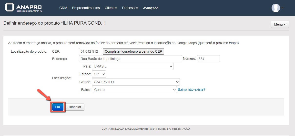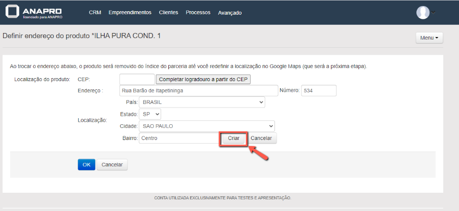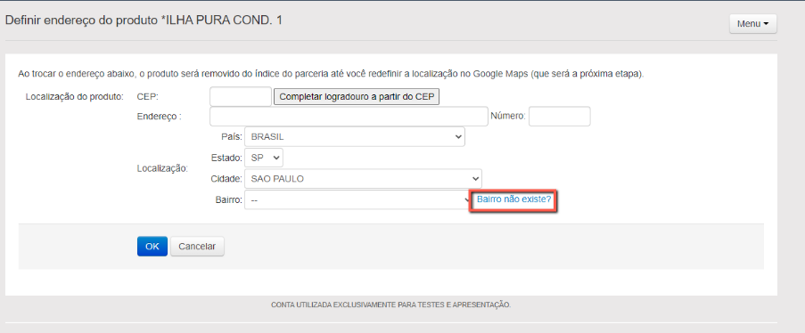 Na tela Definir Endereço do Produto aparecerá o nome do empreendimento. Clique na opção "Bairro não existe?"
