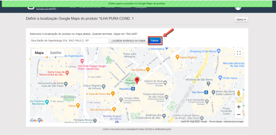 O sistema identificará a localização no Google Maps, mas permitirá que você defina a localização movimentando o marcador, clique em "Salvar".