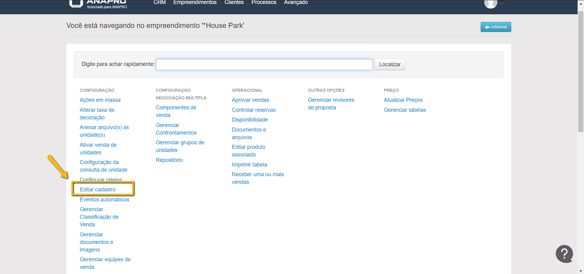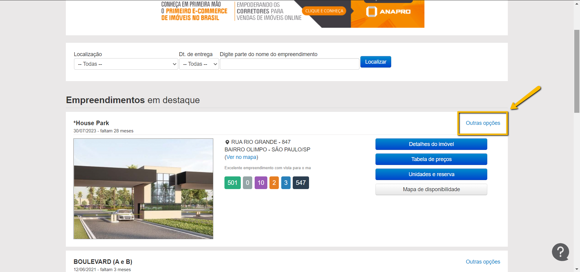 Primeiro iremos em "Outras opções" no empreendimento em questão.