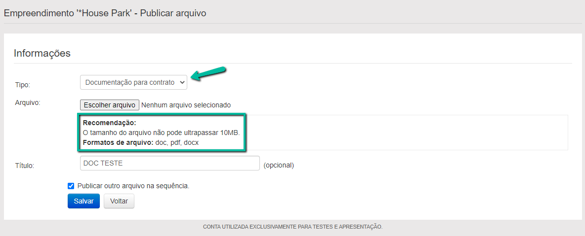 O tipo do documento deve ser "Documentação para contrato", anexe o arquivo e insira o título do mesmo. Sobre formatos e tamanho, segue abaixo.