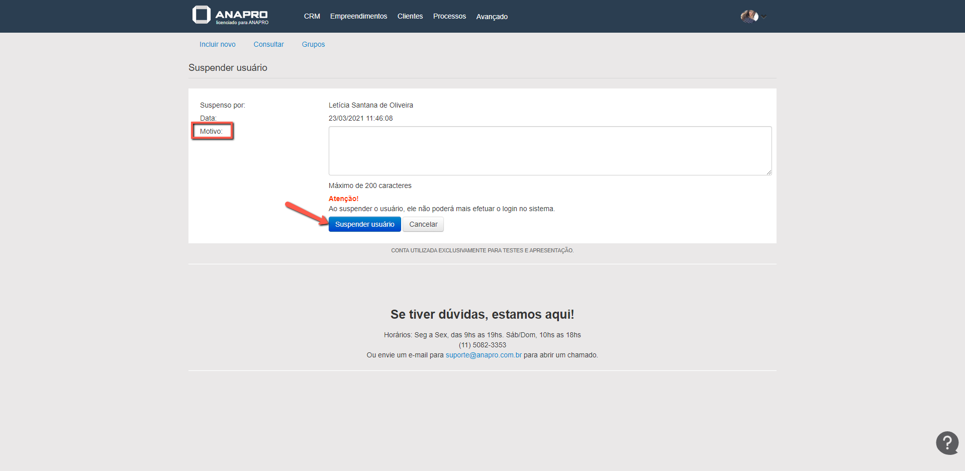 Será necessário informar o motivo da suspensão, e depois basta clicar em "Suspender usuário".