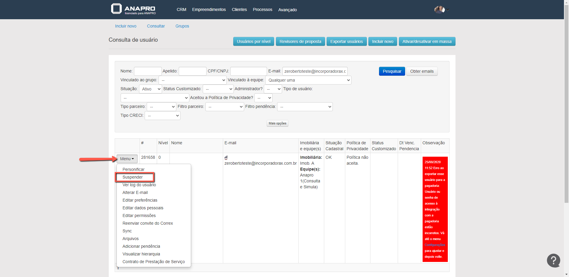 Após localizar o usuário, vamos clicar em "Menu" e depois em "Suspender".