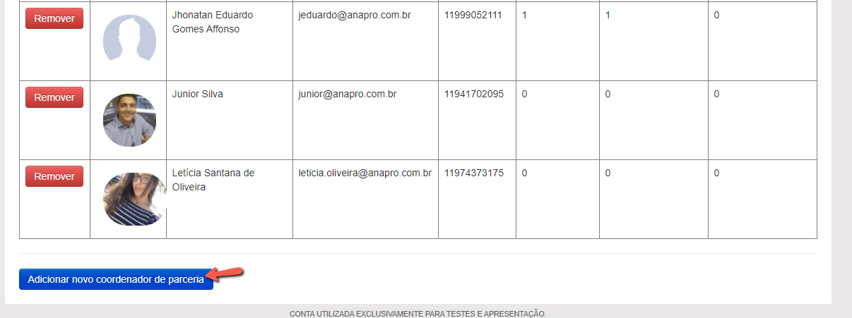 Após clicar no menu informado anteriormente, você terá o menu "Adicionar novo coordenador de parceria" na parte final da página.
