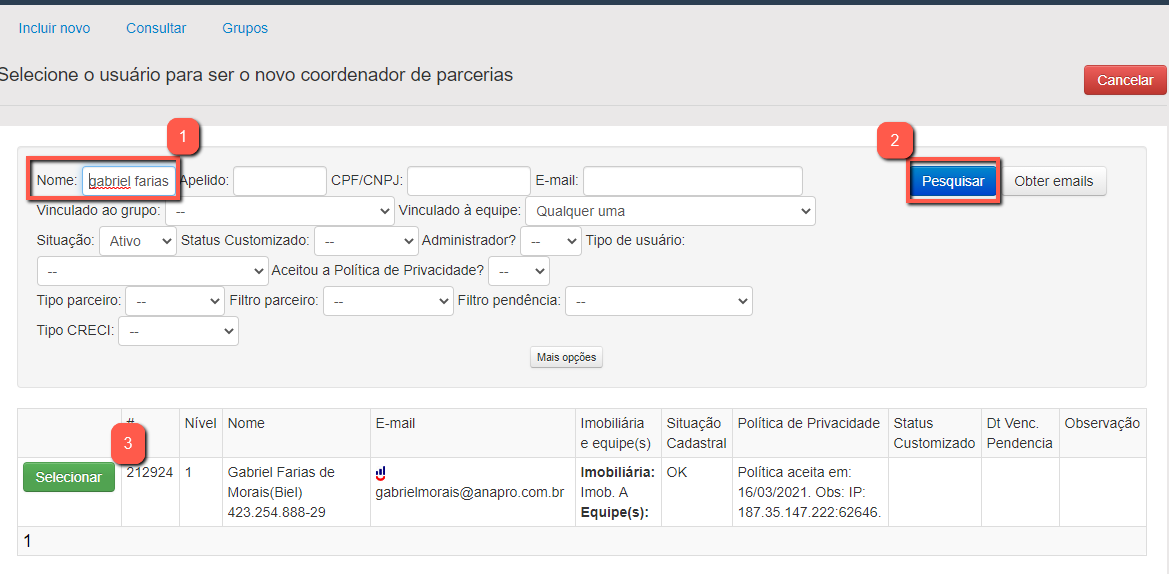 Você será direcionado a página de consulta de usuários, na mesma você irá pesquisar o coordenador pelo nome, cpf/cnpj, e-mail e outros dados caso tenha preferência.
