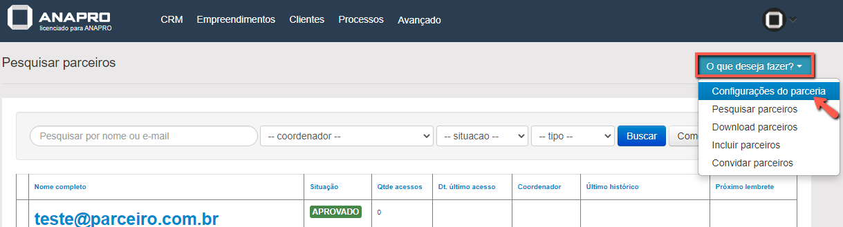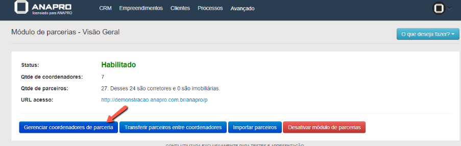 Dentro da aba "Configurações do parcerias" clique em "Gerenciar coordenadores de parceria".