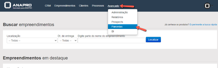 Para isso, acesse Avançado > Parcerias.