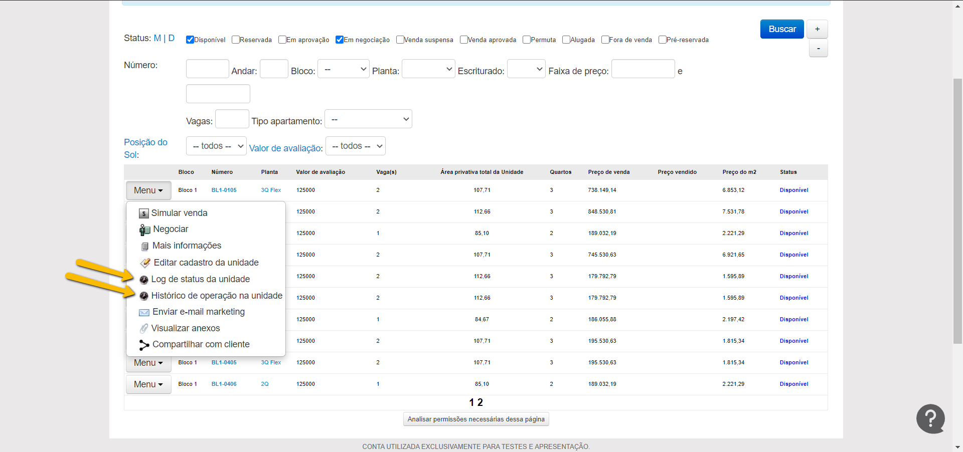Após identificarmos a unidade que queremos verificar os logs e históricos clicamos em menu e veremos a opção de log e histórico.