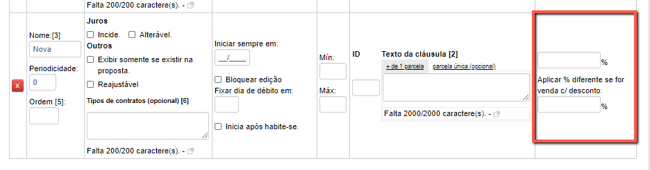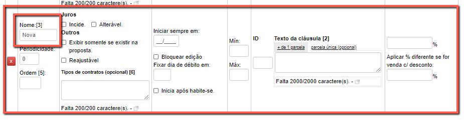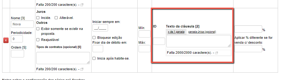 Atenção! No quadro de “Texto da cláusula”, é configurado o texto que será exibido no contrato, ao selecionar a parcela.