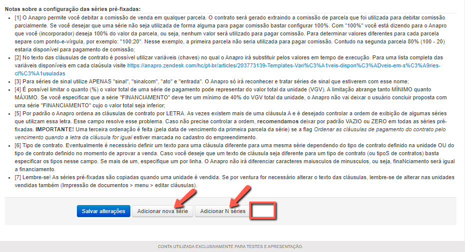 Dentro do menu, você terá as séries já criadas, para criar alguma nova basta descer até o final da página e clicar no menu "Adicionar nova série" ou para incluir mais de uma "Adicionar N Séries" e uma opção de preencher a quantidade [ ].