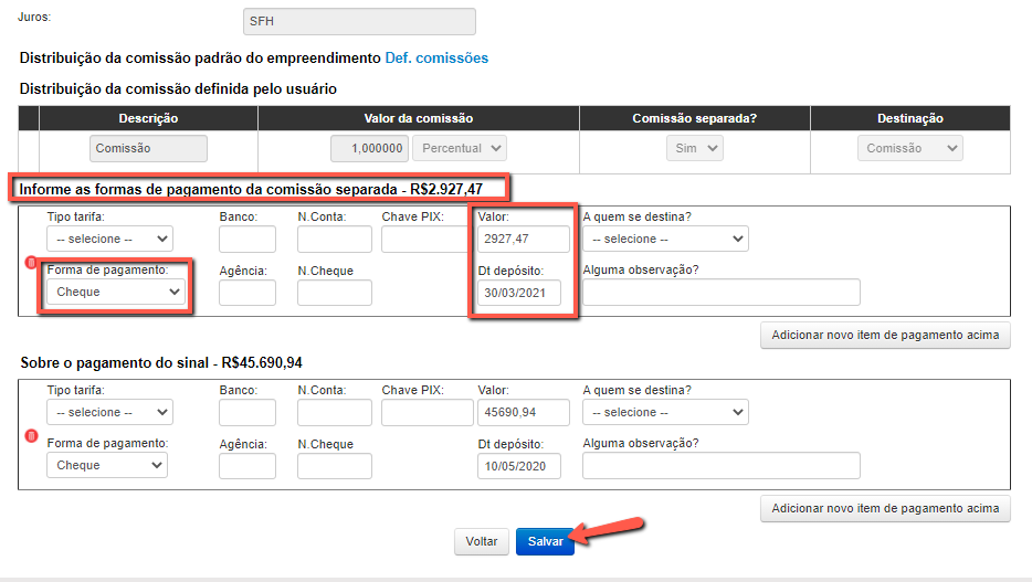 Você consegue definir a forma de pagamento, caso seja boleto, ted, cheque ou pix, por exemplo. O mesmo é válido para o pagamento do sinal.