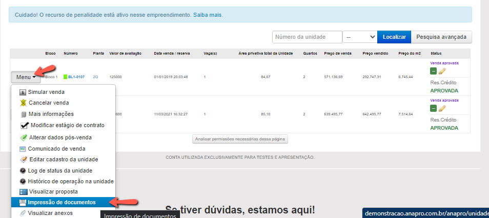 Ao localizar a unidade, clique no menu "Impressão de documentos".