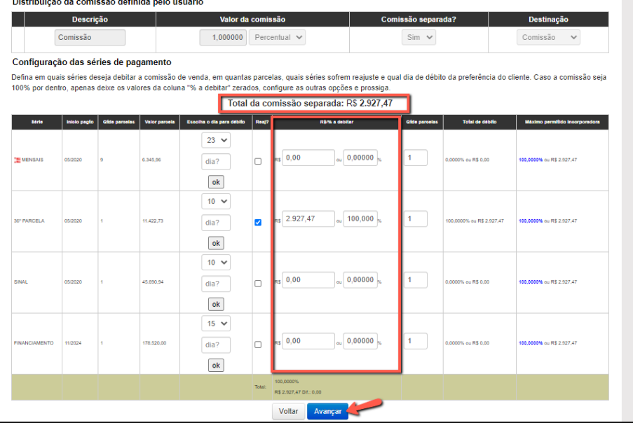Defina em quais séries deseja debitar a comissão de venda, em quantas parcelas, quais séries sofrem reajuste e qual dia de débito da preferência do cliente. Caso a comissão seja 100% por dentro, apenas deixe os valores da coluna "% a debitar" zerados, configure as outras opções e prossiga.