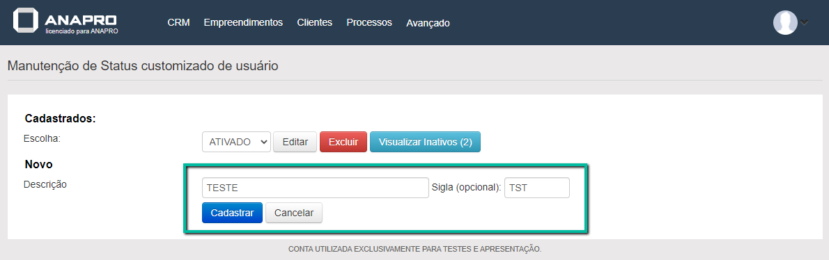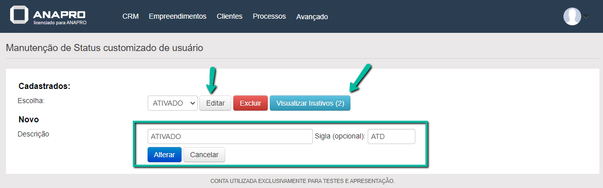 Para editar um status existente, selecione o mesmo e clique em "Editar", assim os campos "Descrição" e "Sigla" ficarão preenchidos com as informações do mesmo. Para concluir a edição selecione "Cadastrar" ou se preferir parar a mesma selecione "Cancelar". Há o botão "Visualizar Inativos" para caso queira verificar os outros que não estão funcionando no momento.