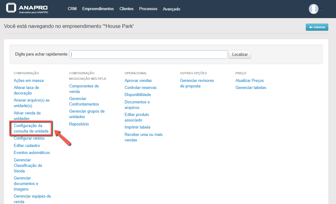 Escolha o empreendimento que deseja configurar, clique em "Outras opções".