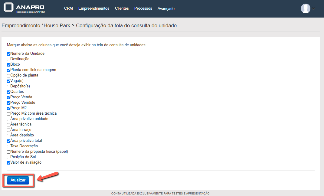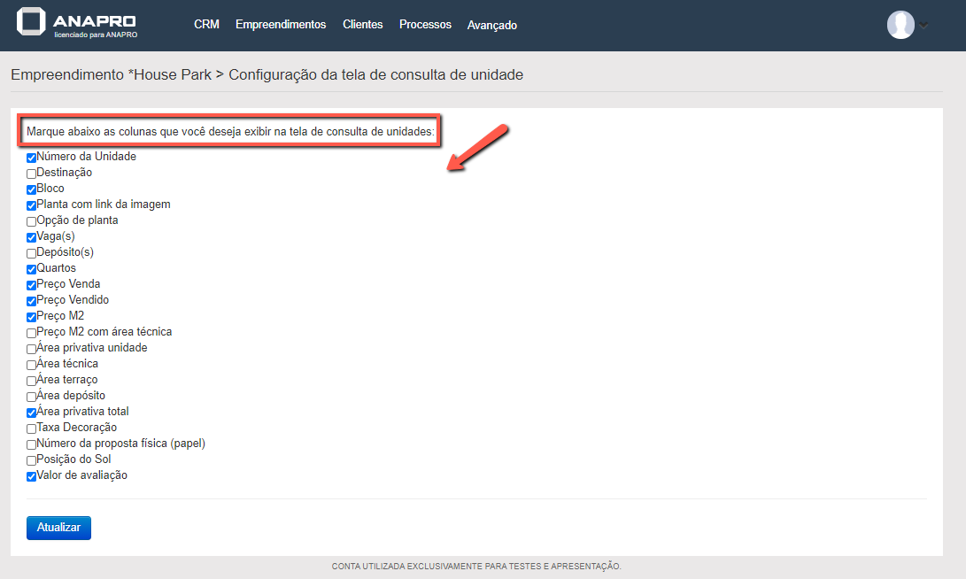 Ao abrir a tela abaixo, será possível selecionar as opções que deseja exibir ao consultar as unidades.