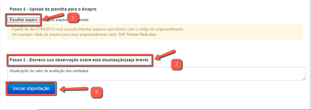 Após salvar, escolha a opção "Escolher arquivo" para subir a planilha atualizada para o sistema. É necessário também escrever uma observação para identificar qual foi a atualização realizada, após, é necessário clicar em "Iniciar importação".