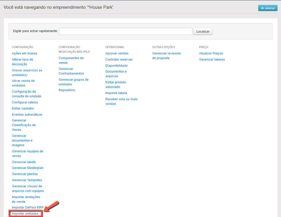 Ao abrir a tela abaixo, na primeira coluna chamada configuração, clique na opção "Importar unidades".