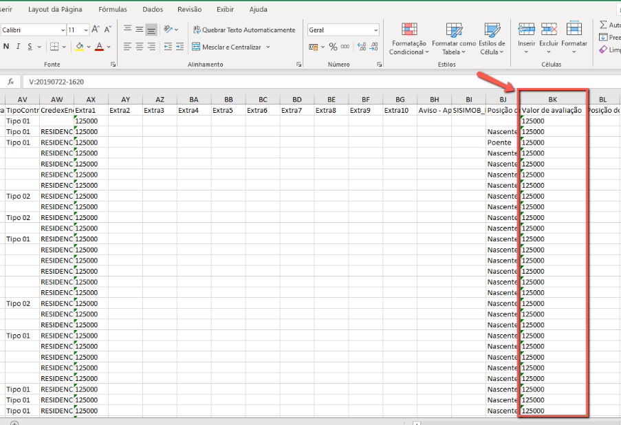Localize a coluna "BK", denominada "Valor de Avaliação", altere os valores para o desejado e salve em seu computador.