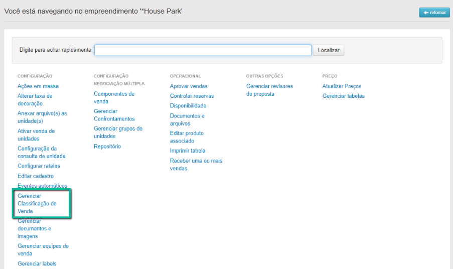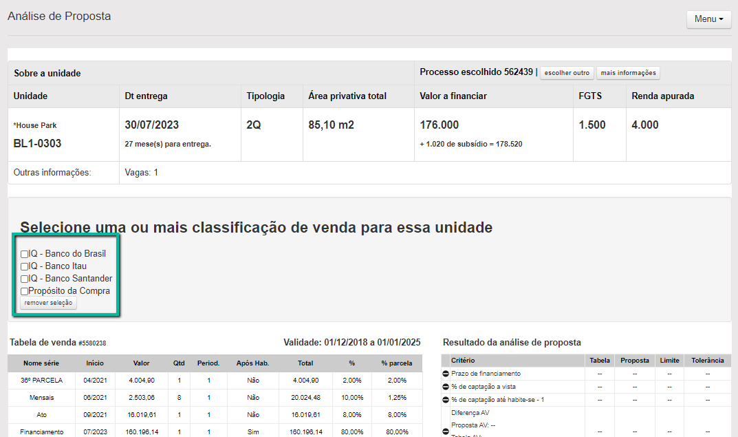 Fora da análise de proposta, para escolher quais serão vinculadas à venda, ao consultar a unidade entre em Menu > Classificar venda.