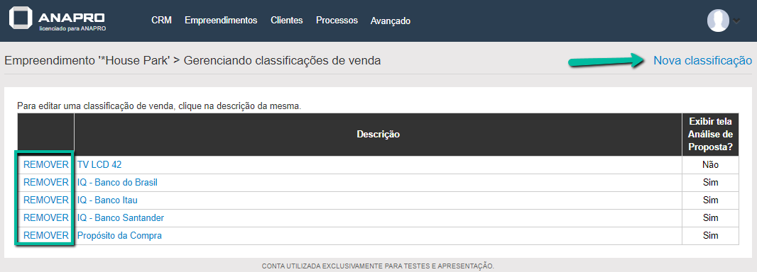 Será exibida a lista de classificações de venda já existentes, onde é possível removê-las e adicionar novas como no print abaixo.
