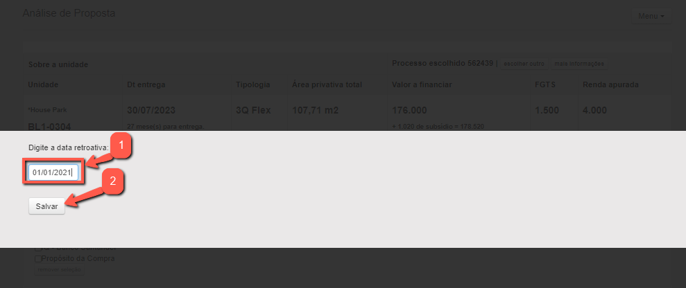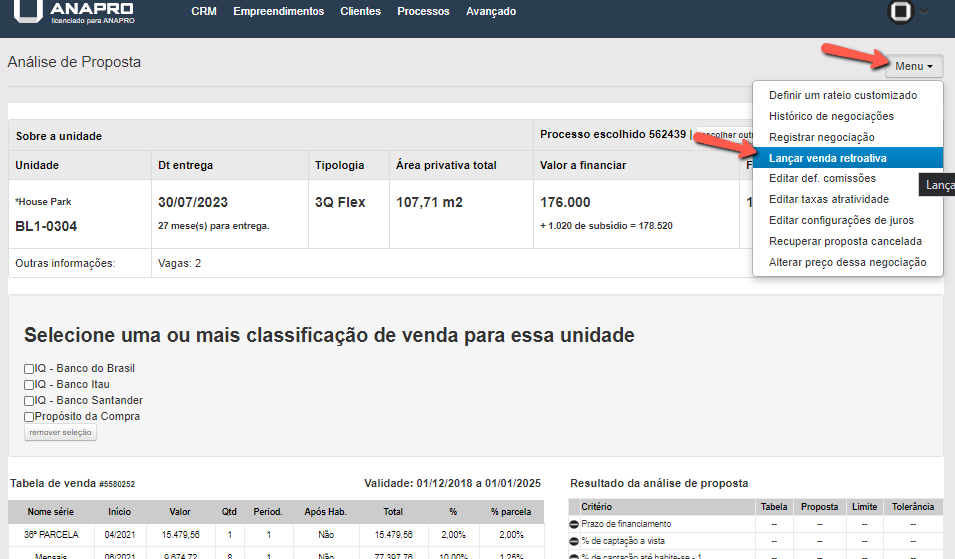 Clicando em "Negociar" você irá se deparar com a tela de análise da proposta, logo no início da tela, terá um menu, clique no mesmo e vá na opção "Lançar venda retroativa".
