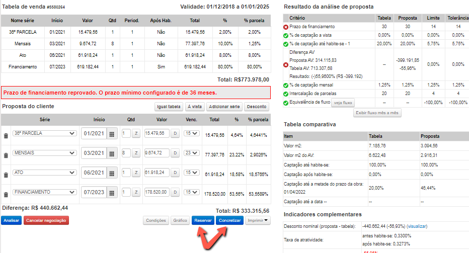 Feito isto, basta montar o fluxo com as formas de pagamento e vencimento desejado. Clique em "Analisar" e caso necessário vá em "Reservar" ou "Concretizar".