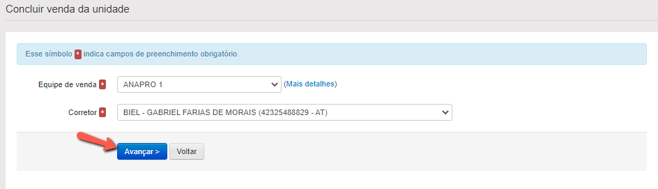 Confirme os dados da equipe e corretor desta venda, clique no "Avançar".