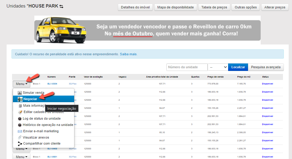 Após clicar no painel, você irá se deparar com todas as unidades disponíveis, escolhendo a unidade desejada clique no menu "Negociar".