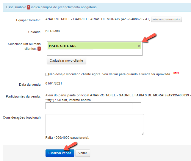 Depois de avançar, basta atrelar o cliente a esta unidade e por fim, clique no menu "Finalizar venda".