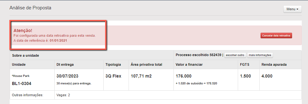 Após processar a data informada, na parte de cima da tela de análise da proposta aparecerá a seguinte mensagem avisando.