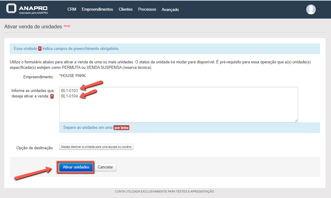 Esta é a tela que abrirá para ativar a venda das unidades, insira o número das unidades e clique em "Ativar unidades".