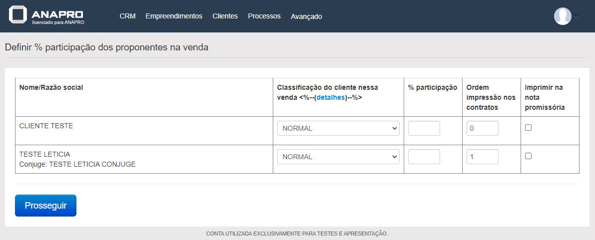 E por último outras opções como classificação do cliente (representante e/ou procurador, por exemplo), percentual de participação, ordem em que os dados aparecerão no contrato e se serão impressos na nota promissória.