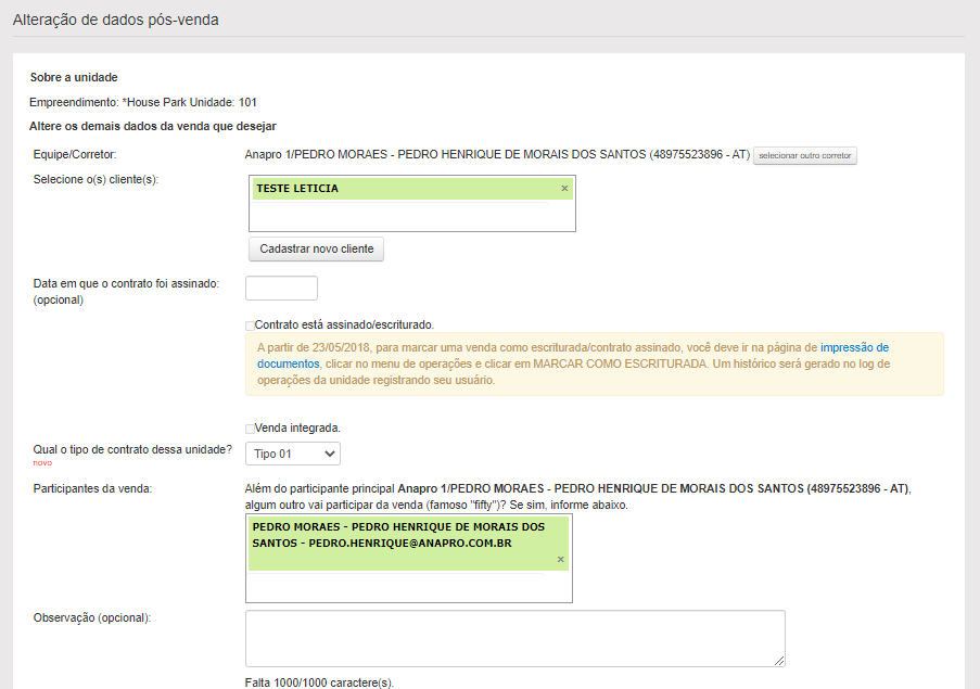 Depois será possível mudar o cliente e os participantes da venda (caso haja mais de um), incluindo observações.