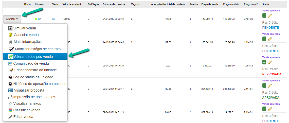 Para isso, acesse a Consulta de Unidades e entre em Menu > Alterar Dados Pós-Venda.