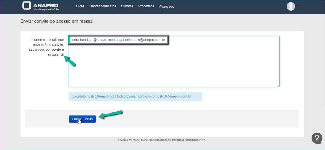 Insira os e-mails que deseja os separando através de uma vírgula como no exemplo abaixo e quando terminar clique em "Enviar E-mails".