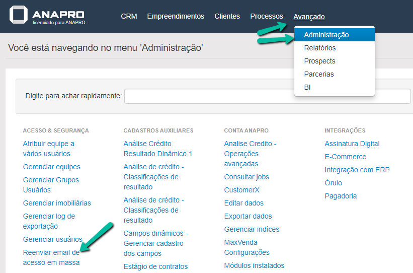Para isso, acesse Avançado > Administração > Reenviar e-mail de acesso em massa.