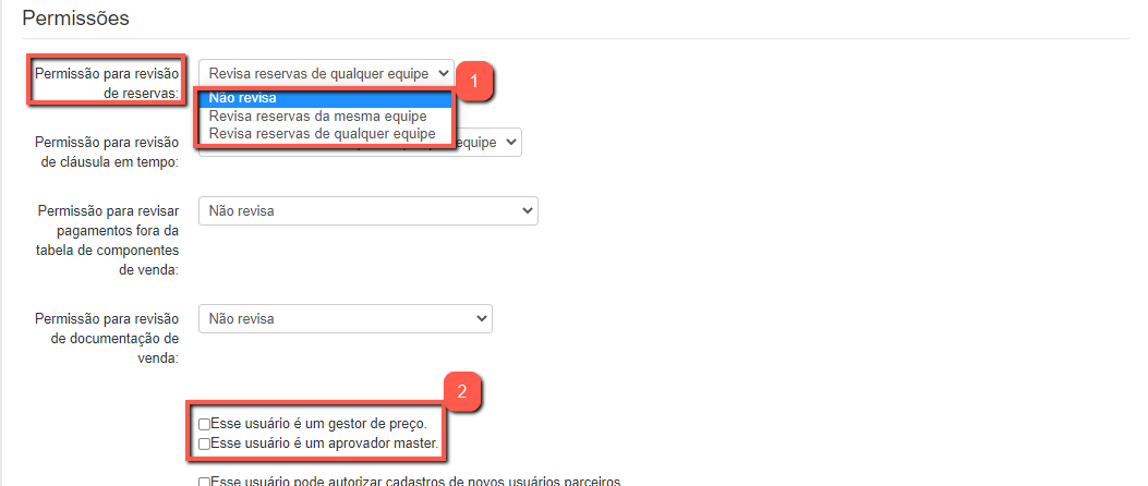 Neste item, você irá localizar "Permissão para revisão de reservas" e selecione quais revisões este usuário será responsável, se irá revisar da mesma equipe ou de qualquer equipe.